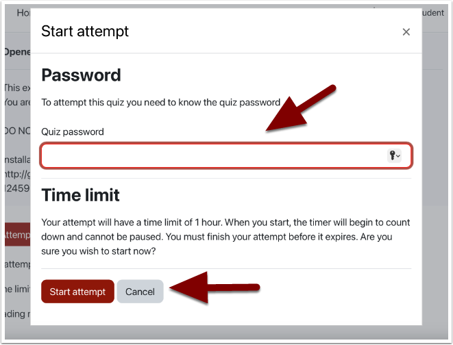 When the student logs in to the test, they will see a pop up window asking for the password when they attempt to begin the test. Once the password is entered, they will be able to proceed and complete their quiz by clicking on the “Start attempt” button.