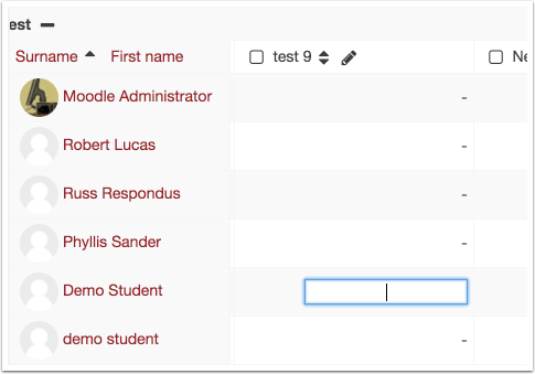 You may need to use your keyboard arrow keys or mouse to scroll the grade window so that the grade column for the grade you need to record is visible on the screen. Once it is visible, click the cell for the grade you want to enter.
