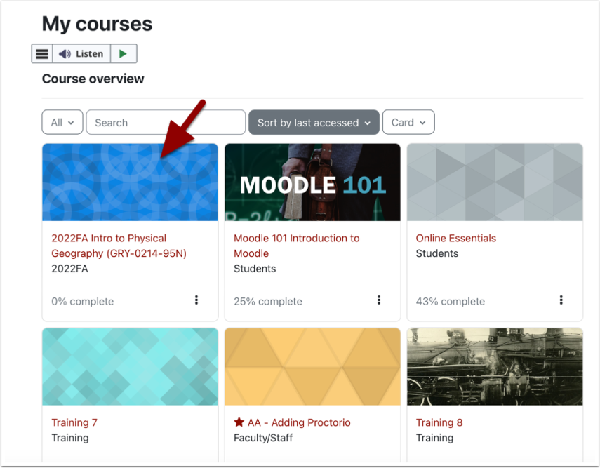 On the My courses page in your Course Overview, you’ll see tiles for each of the courses you are enrolled in within Moodle. Click on a specific course tile to access that course.