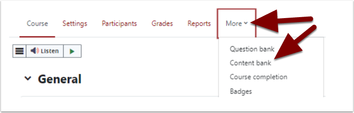 Select a course. Under the course title click on the “More” dropdown menu and select “Content bank.”