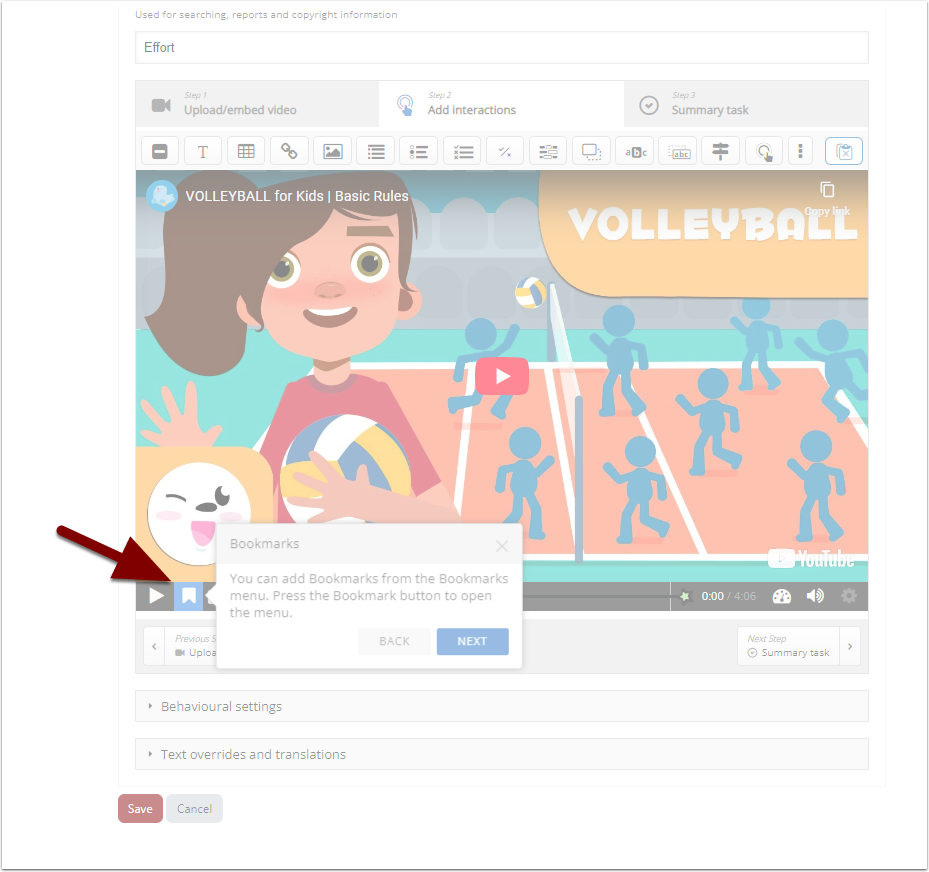 Add bookmarks to your video from the “Bookmarks” menu. Bookmarks indicate new topics, interaction points, or events within the video.
