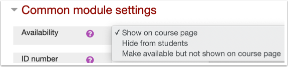 If you want students to start posting right away, go to the Common module settings section and make sure that “Availability” is set to “Show on course page.” If you don’t want students to access the forum yet, set this to “Hide from students.”