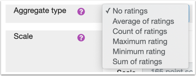 Choose how to grade the forum by setting a method either in “Whole forum grading” or “Ratings” (not both). “Ratings” is the standard way to set up a graded forum — although “Whole forum grading” might be a better choice in some situations. Setting a grade up in the “Ratings” section, first select the “Aggregate type” based on your preferred grading scheme. For example, “Sum of ratings” adds up all the points you give for each post by a student. Meanwhile, “Maximum” only records the points for the highest score you give on a single post for a student (even if you grade multiple posts).