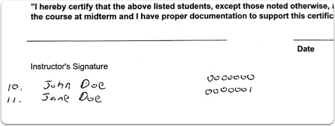 Only the instructor of origin should sign these sheets with an actual signature. Do not sign for another instructor. Do not type your signature. It must be an actual signature. Please no markers or highlighters.
