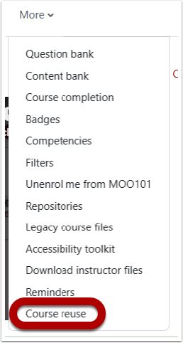 Go to the class you want to import content into and click on the “More” tab. Then click on “Course reuse.”