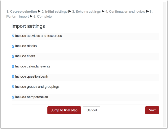 If you want to select only specific parts of the course to import, DO NOT click “Jump to final step.” Instead, click “Next.” This will allow you to select only the specific parts of the course you want to import.