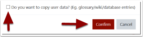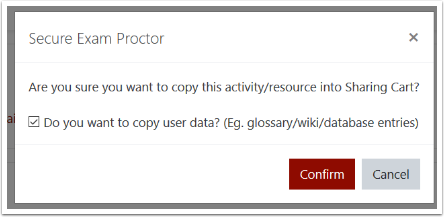 On the confirmation window, uncheck the checkbox if you don’t want to copy user data into the Sharing Cart (important if you are copying an activities, like a quiz, that has user data) and click Confirm.