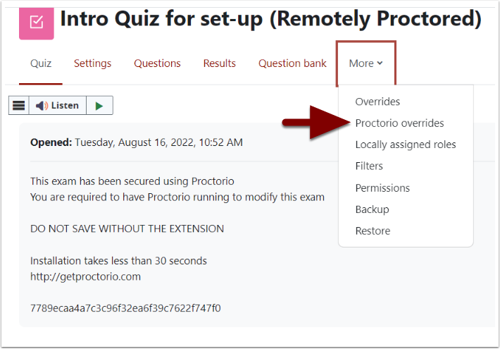 First go to the test’s landing page in your Moodle course. On the landing page you will see a row of links at the top. Click the link to “More” settings on the right. In the dropdown menu, look for “Proctorio overrides.” Click that link.