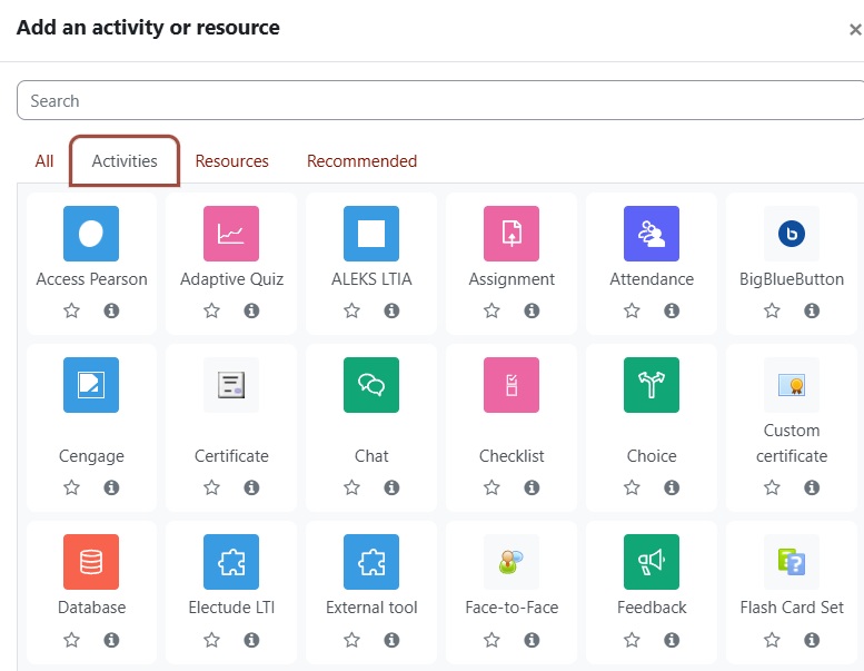Activities include assignments, quizzes and discussion forums, to name a few. The Activities tab of the resource window shows all your choices.