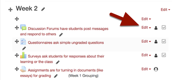 With editing on, you’ll see a variety of menu links and icons that allow you to edit and change the status of content in your class. Toggle editing back off for a cleaner view of your course.