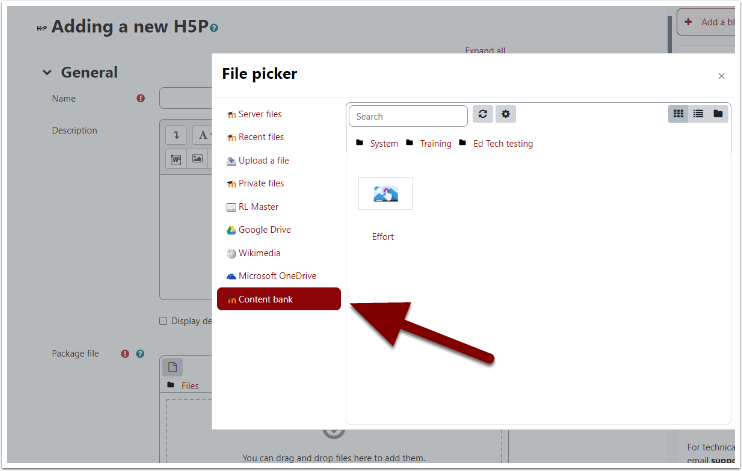 Option two for adding video as an activity is to select it from your content bank. As with option one, open the activities and resources menu and select H5P.