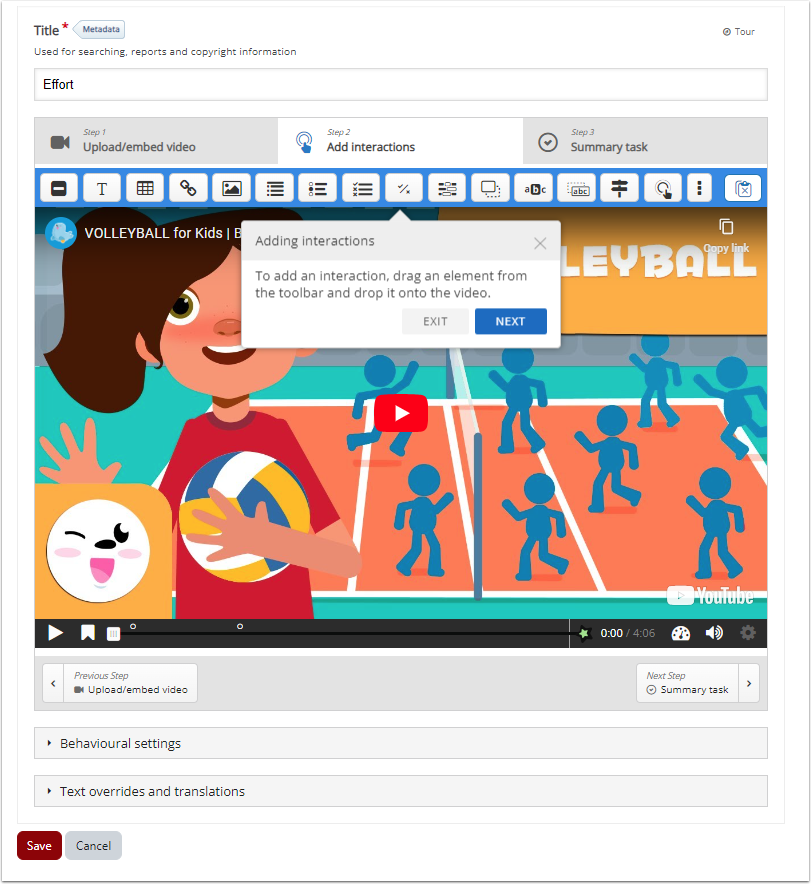 To add an interaction, drag an element from the toolbar above the video and drop it somewhere on the video.
