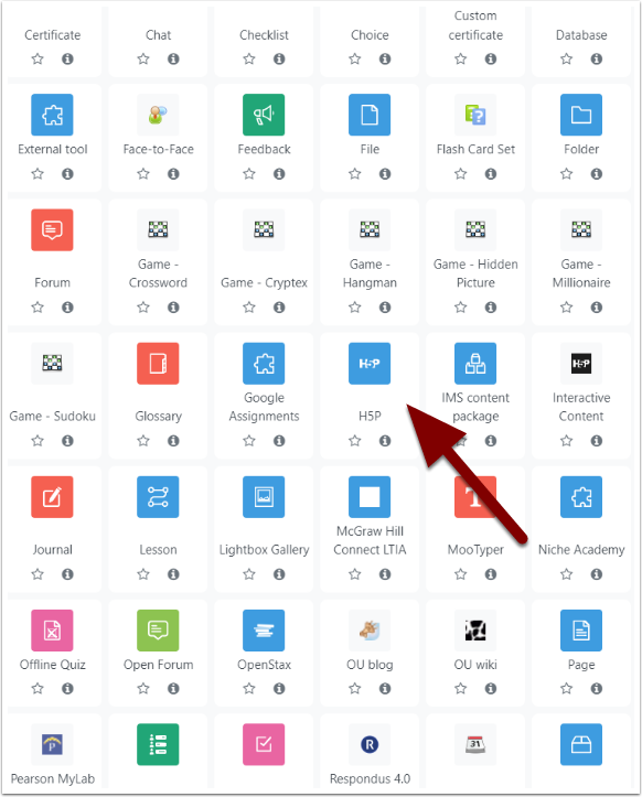 Option one for adding video as an activity is to download your completed H5P video first. Then, select H5P.