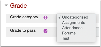 Next, choose the Grade category under which this graded activity will appear in the gradebook. Only categories you’ve already created will appear here in the dropdown menu.