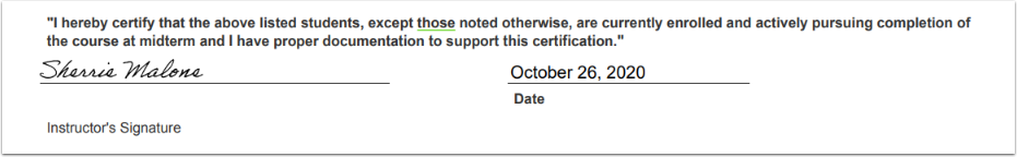 Only the instructor of origin should sign these sheets with an actual signature. Do not sign for another instructor. Do not type your signature. It must be an actual signature. Please no markers or highlighters.