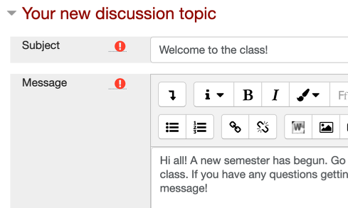 The Announcements forum appears in the introductory section of every Moodle class. To post a message to students, open the forum and click the Add a new topic button.