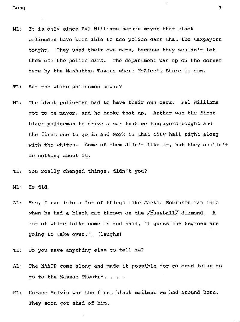 Home » Library » Local History Project » Arthur Long, Interviewed by Tammy Long (8 Pages)Arthur Long, Interviewed by Tammy Long (8 Pages)Experiences as a Black Police Officer in Metropolis.